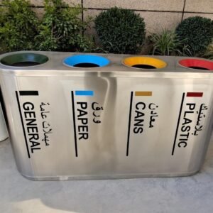 سلة نفايات مخصصة للأماكن الخارجية مثل الحدائق والمولات، تأتي مجهزة بأربع فتحات مخصصة لفصل النفايات؛ بلاستيك، ورق، كانز، ونفايات عامة. تم تصنيعها باستخدام أجود أنواع الستانلس ستيل لتوفير متانة ومقاومة فائقة ضد مختلف ظروف الطقس، مما يجعلها مثالية للاستخدام في الهواء الطلق أو الأماكن المغلقة.